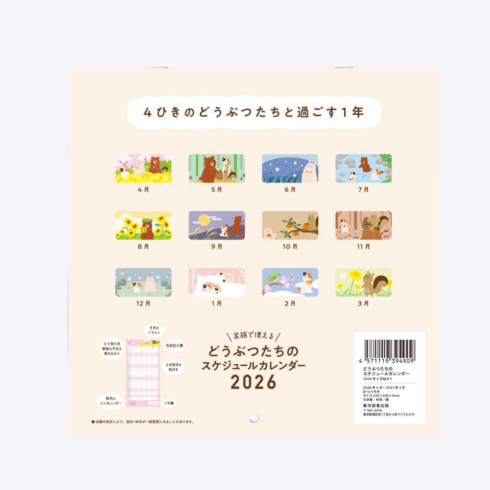 山で一緒に暮らす4ひきの「どうぶつたち」がかわいい壁掛けカレンダーです。