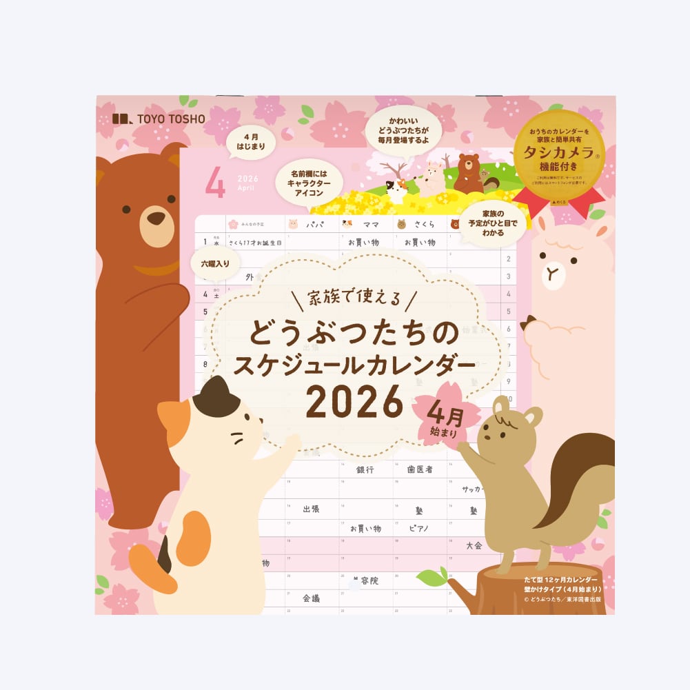 内容:カレンダー計12ヶ月分(2026年4月~2027年3月)、年間カレンダー、名前記入欄、メモ欄、翌月ミニカレンダー、六曜、タシカメラ1年分アカウント
