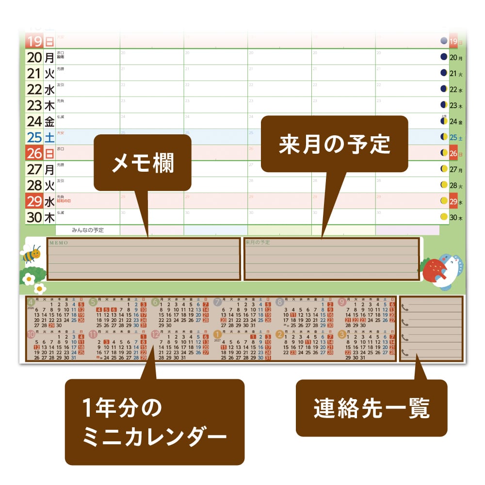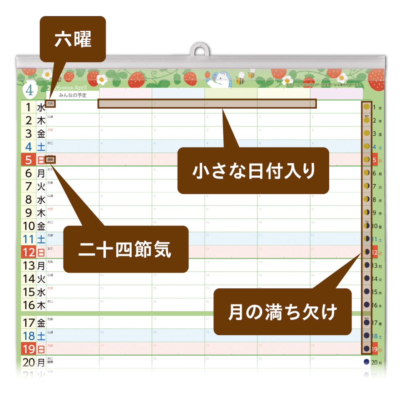 年度区切りで学校行事の把握にも便利な、4月始まりカレンダー。